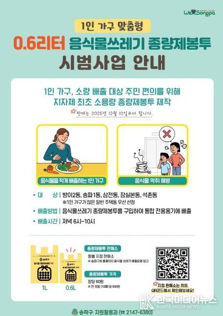 [ 한국미디어뉴스 이원영 기자 ] 서울 송파구가 전국 지방자치단체 최초로 1인 가구에 최적화된 0.6ℓ 규격의 음식물쓰레기 종량제봉투를 오는 10일부터 시범 도입해 운영한다고 알렸다.