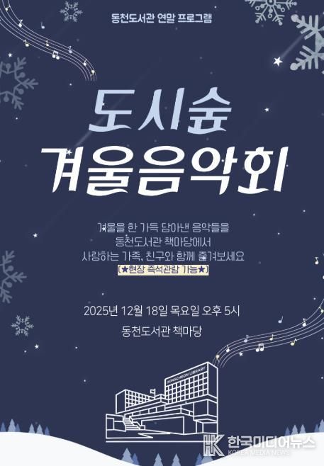 [ 한국미디어뉴스 이원영 기자 ] 용인특례시 동천도서관은 18일 오후 5시부터 6시까지 동천도서관 지하 1층 책마당(열람형 계단공간)에서 ‘도시숲 겨울 음악회’를 연다고 밝혔다.