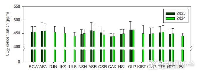 예를 들어 2023부터 2024년까지 11개 지점에 대한 이산화탄소(CO2)의 연평균 농도는 같은 기간 안면도 배경농도 상승폭인 3.1ppm보다 작은 1.1ppm이 상승한 것으로 나타났다.
