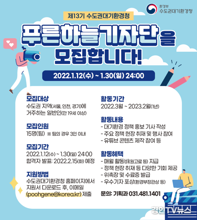 [ 경인TV뉴스 주재영 기자 ] 환경부 소속 수도권대기환경청은 “제13기 푸른하늘기자단”을 1월 12일(수)부터 1월 30일(일)까지 모집한다고 밝혔다.