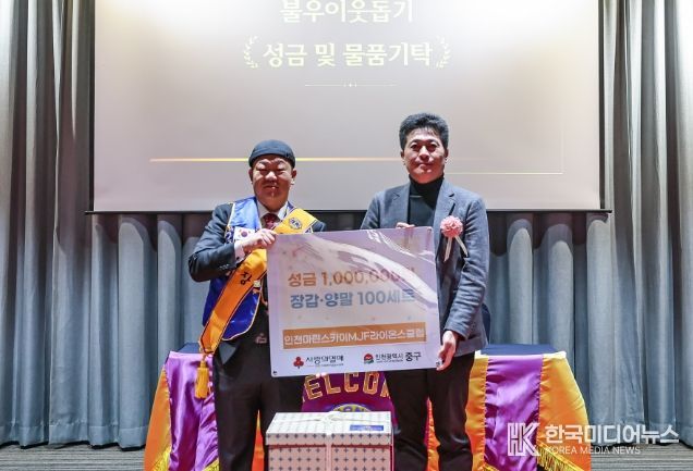 [ 한국미디어뉴스 최치남 기자 ] 인천시 중구는 지난 12일 ‘인천마린스카이MJF라이온스클럽(회장 장준희)’이 연말연시를 맞아 지역 내 어려운 이웃을 돕기 위해 성금 100만 원과 방한용품(수면 양말, 장갑) 100세트를 기탁했다고 밝혔다.