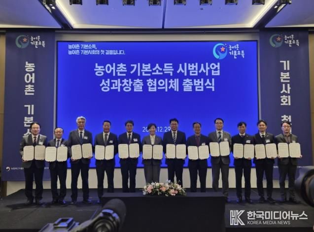 행사에서는 기본사회 강연을 시작으로 농어촌기본소득 시범사업 추진계획과 지역별 특화모델 운영 방향, 연구단 구성·운영 및 정책평가 계획이 공유됐다. 이어 농식품부–경인사연–10개 군이 참여하는 업무협약 체결과 협의체 출범 퍼포먼스, 기념촬영이 진행됐다.