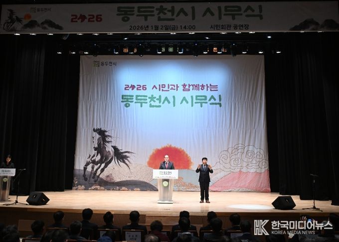 [ 한국미디어뉴스 김서안 기자 ] 동두천시는 2026년 병오년(丙午年) 새해를 맞아 1월 2일 오후 2시 시민회관 공연장에서 시민과 함께하는 ‘2026년 시무식’을 개최했다.