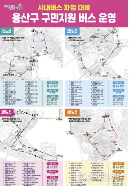 용산구 관계자는 “시내버스 파업으로 교통 혼잡과 이동 불편이 발생하고 있는 만큼, 마을버스와 지하철 이용, 승용차 함께 타기 등 교통 수요 분산에 구민 여러분의 적극적인 협조를 부탁드린다”라고 말했다.