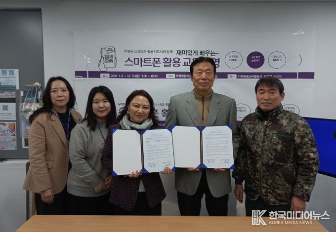 [ 한국미디어뉴스 양선희 기자 ] 부평구 산곡노인문화센터는 지난 16일 부평종합시장 고객지원센터에서 부평종합시장상인회와 ‘1:1 맞춤형 온라인 길라잡이’ 사업추진을 위한 업무협약식을 체결했다.