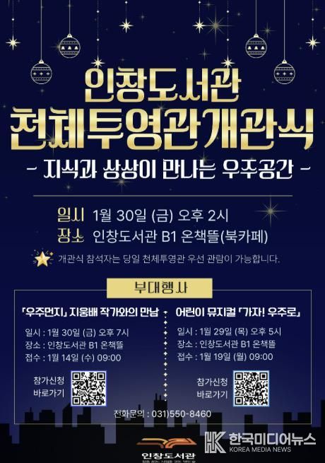 [ 한국미디어뉴스 김서안 기자 ] 구리시는 오는 1월 30일 오후 2시 인창도서관 지하 북카페에서 주요 내빈이 참석한 가운데 4층 야외에 조성된 인창도서관 천체투영관 개관식을 개최한다고 밝혔다.