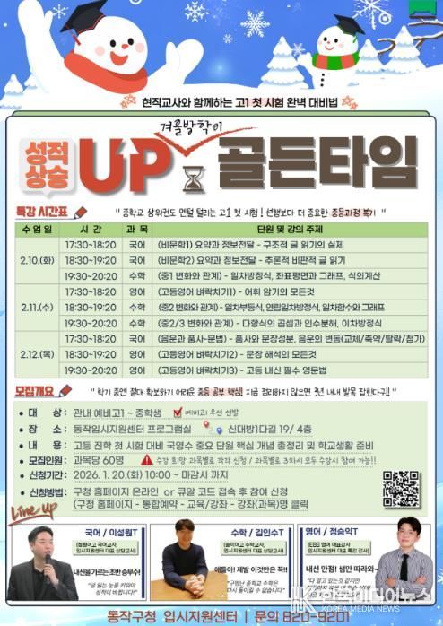 [ 한국미디어뉴스 이보영 기자 ] 동작구가 2월 10일부터 12일까지 3일간 예비 고1 학생들을 대상으로 '국·영·수 골든타임 특강'을 개최한다고 밝혔다.