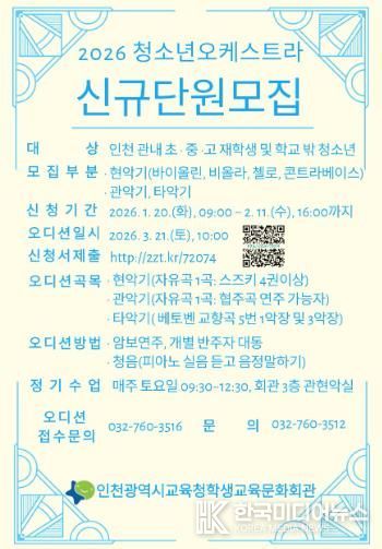 [ 한국미디어뉴스 이원영 기자 ] 인천광역시교육청학생교육문화회관은 3월 21일 ‘2026학년도 청소년오케스트라 단원 모집 오디션’을 실시한다.