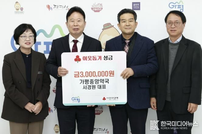 [ 한국미디어뉴스 김서안 기자 ] 가평중앙약국 서경원 대표는 21일 이웃돕기 성금 300만원을 가평군에 기탁하며 지역사회 나눔 실천에 동참했다.