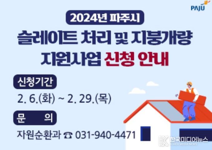 [ 한국미디어뉴스 민경환 기자 ] 파주시는 노후 슬레이트 주택에 대한 시민건강 피해를 예방하고 쾌적한 생활환경을 조성하고자 2026년 슬레이트 철거 및 지붕개량 사업을 실시한다.