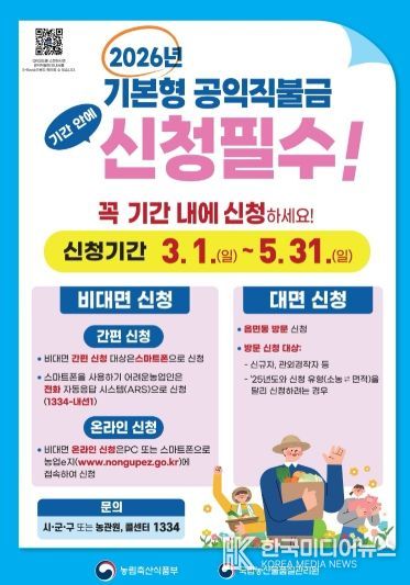 [ 한국미디어뉴스 김서안 기자 ] 양주시가 농업·농촌의 공익기능 증진과 농업인의 소득 안정을 위해 ‘2026년 기본형 공익직접지불금’을 오는 3월 1일부터 5월 31일까지 신청받는다.