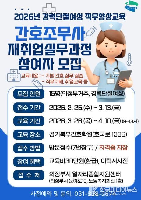[ 한국미디어뉴스 김서안 기자 ] 의정부시는 관내 경력단절여성 구직자를 위한 맞춤형 직업교육으로 ‘간호조무사 재취업 실무과정’ 참여자를 모집한다.