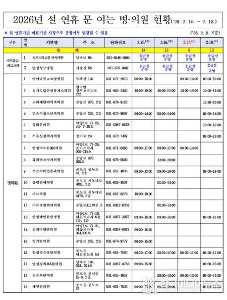 시 관계자는 “설 연휴 기간 의료 공백과 시민 불편을 최소화해 안전하고 편안한 명절이 되도록 최선을 다하겠다”고 말했다.