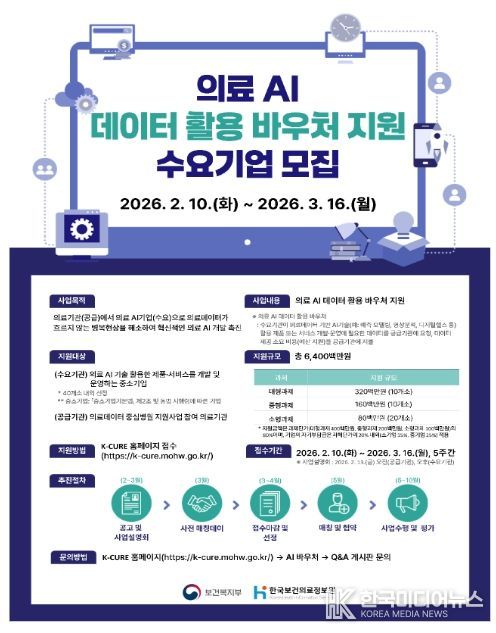 [ 한국미디어뉴스 이원영 기자 ] 보건복지부와 한국보건의료정보원(원장 염민섭)은 안전한 의료데이터 활용 촉진을 위해 2월 10일부터 3월 16일까지'의료 AI 데이터 활용 바우처 지원사업'에 참여할 수요기업을 모집한다고 밝혔다.