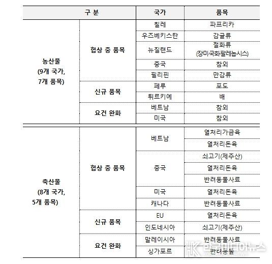 ① 딸기(브라질), 단감(중국), 포도(필리핀), 쇠고기·돼지고기(싱가포르), 반려동물사료(베트남·인도네시아), 필리핀(열처리돈육가공품) 등