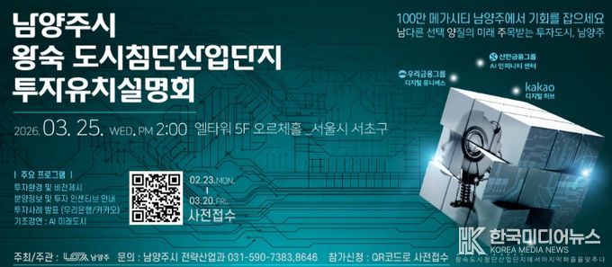 [ 한국미디어뉴스 김서안 기자 ] 남양주시는 오는 3월 25일 서울 서초구 엘타워 오르체홀에서 ‘남양주시 왕숙 도시첨단산업단지 투자유치설명회’를 개최하며, 이에 앞서 3월 20일까지 참여 희망 기업을 대상으로 사전접수를 진행한다고 밝혔다.