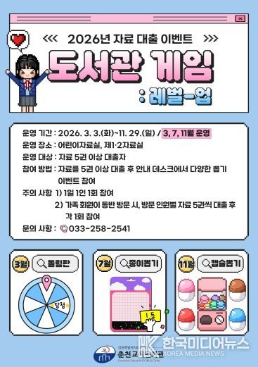 [ 한국미디어뉴스 이원영 기자 ] 춘천교육문화관은 3월, 7월, 11월 춘천교육문화관 이용자를 대상으로 자료 대출 이벤트 ‘도서관 게임: 독서 레벨-업’을 운영한다.