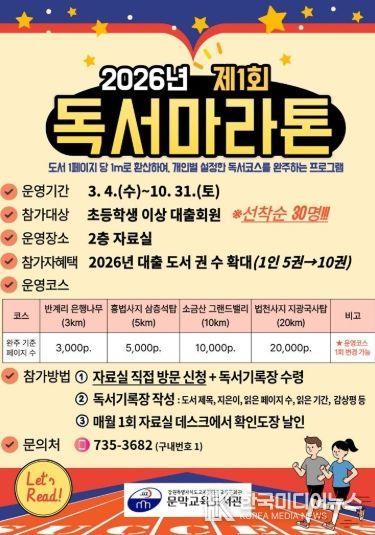 [ 한국미디어뉴스 이원영 기자 ] 문막교육도서관은 관내 이용자의 지속적인 독서 습관 형성 및 함께 읽는 독서문화조성을 위해 2026년 제1회 ‘독서마라톤’을 운영한다.