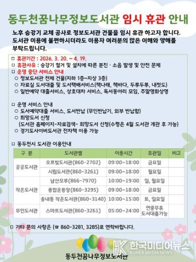 [ 한국미디어뉴스 김서안 기자 ] 동두천시 도서문화사업소 꿈나무정보도서관은 노후 승강기 교체 공사 시행에 따라 오는 3월 20일부터 4월 19일까지 임시 휴관한다고 밝혔다.