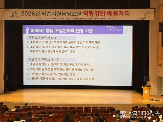 [ 한국미디어뉴스 이원영 기자 ] 충남교육청은 26일 충남교육청학생교육문화원(천안)에서 2026년 학습 지원 담당 교원 410명과 14개 시군 교육지원청 기초학력 담당 장학사를 대상으로 배움자리를 개최했다.