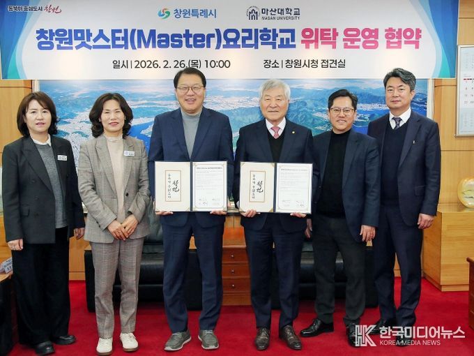 [ 한국미디어뉴스 김홍철 기자 ] 창원특례시는 2월 26일 시청 접견실에서 마산대학교와 '창원맛스터(Master)요리학교 위탁운영 업무협약'을 체결하고, 향후 3년간 지역 외식업 경쟁력 강화를 위한 전문인력 양성 사업을 추진한다.