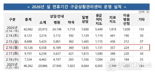 [ 한국미디어뉴스 황영수 기자 ] 소방청은 2026년 설 연휴 기간(2.14.~2.18., 5일간)전국 총 45,082건의 구급 출동으로 24,166명을 이송하였으며, 구급상황관리센터에서 총 42,062건의 상담을 실시했다고 밝혔다.