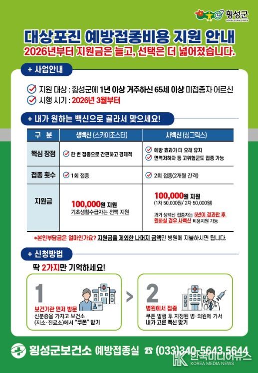 [ 한국미디어뉴스 이원영 기자 ] 횡성군이 고령층의 극심한 통증과 후유증을 유발하는 대상포진을 예방하기 위해 오는 3월부터 ‘2026년 대상포진 예방접종 비용 지원사업’을 확대 시행한다.