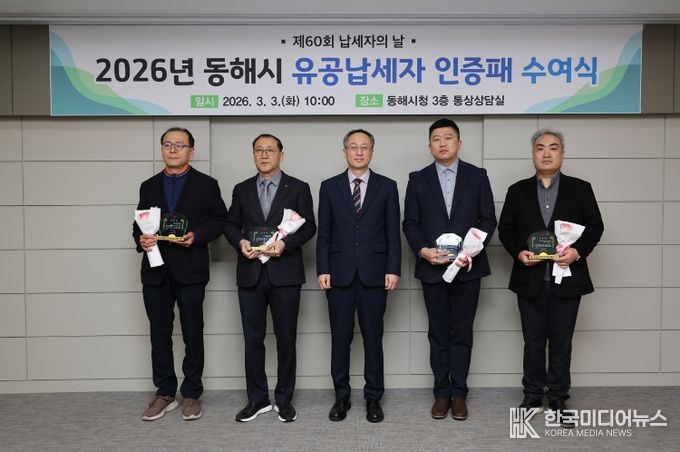[ 한국미디어뉴스 이원영 기자 ] 동해시는 3월 3일 '제60회 납세자의 날'을 맞아 시청 통상상담실에서 유공납세자 인증패 수여식을 열고 성실납세자들에게 감사의 뜻을 전했다.