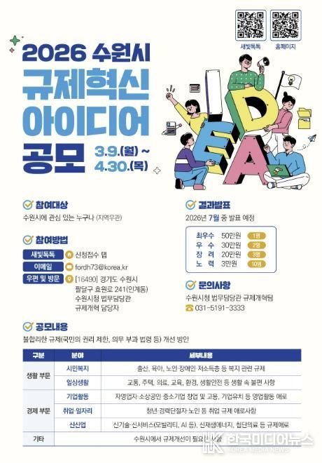 [ 한국미디어뉴스 김일규 기자 ] 수원특례시가 9일부터 4월 30일까지 ‘2026 규제혁신 아이디어’를 공모한다.