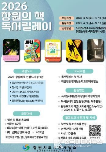 [ 한국미디어뉴스 김홍철 기자 ] 창원시도서관사업소는 시민이 한 권의 책을 함께 읽고 소통하며 책 읽는 공동체 문화를 확산하기 위해 ‘2026 창원의 책 독서릴레이’ 참가팀을 모집한다.