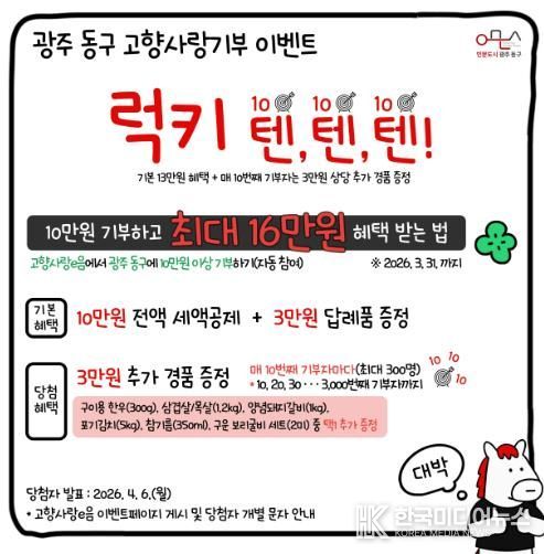 [ 한국미디어뉴스 이종철 기자 ] 광주 동구는 고향사랑기부 참여 확대를 위해 특별 이벤트 ‘럭키 텐텐텐(Lucky 10·10·10)’을 3월 한 달간 운영한다고 밝혔다.