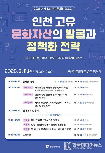 [ 한국미디어뉴스 이원영 기자 ] 인천문화재단은 오는 2026년 3월 11일 오후 2시부터 5시까지 인천아트플랫폼 C동 공연장에서 '2026년 제1회 인천문화정책포럼'을 개최한다.