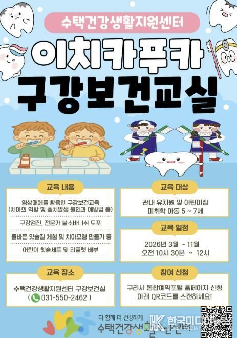 [ 한국미디어뉴스 김서안 기자 ] 구리시는 수택건강생활지원센터에서 미취학 아동의 올바른 구강 관리 습관 형성과 치아우식증 예방을 위해 관내 유치원과 어린이집 아동을 대상으로'이치카푸카 구강보건 교실'을 2026년 3월부터 11월 말까지 운영한다고 밝혔다.