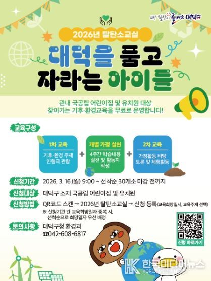교육 신청은 오는 16일 오전 9시부터 대덕구 홈페이지 ‘구민참여 - 행사접수 - 2026년 탈탄소교실’ 메뉴에서 선착순으로 접수할 수 있다.