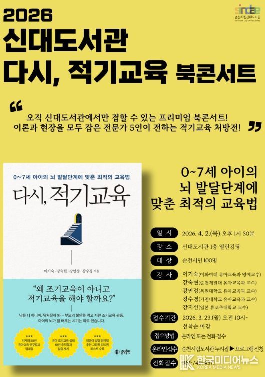 [ 한국미디어뉴스 이종철 기자 ] 순천시 신대도서관은 오는 4월 2일 오후 1시 30분, 신대도서관 열린강당에서 영유아 학부모와 교육 관계자 100명을 대상으로 ‘다시, 적기교육’ 북콘서트를 개최한다고 밝혔다.