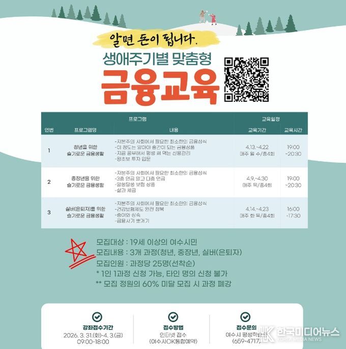 [ 한국미디어뉴스 이종철 기자 ] 여수시는 시민들의 금융 이해도 향상을 위해 생애주기별 맞춤형 금융교육 참여자를 모집한다고 밝혔다.