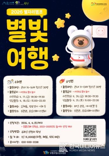 [ 한국미디어뉴스 양선희 기자 ] 부평구청소년수련관은 지역 내 11~16세 청소년을 대상으로 천문 과학 별자리 체험 프로그램인 2026 별자리캠프 ‘별빛여행’ 참가자를 모집한다.