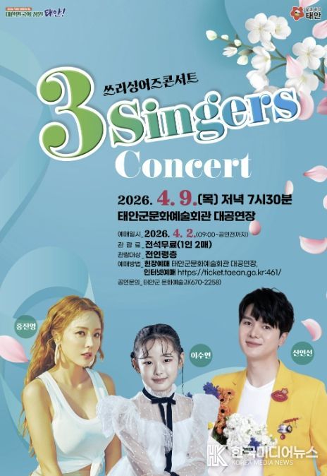 [ 한국미디어뉴스 이원영 기자 ] 태안군이 4월 9일 태안군문화예술회관 대공연장에서 홍진영 등 유명 가수가 출연하는 ‘3-Singers 콘서트’를 개최한다.