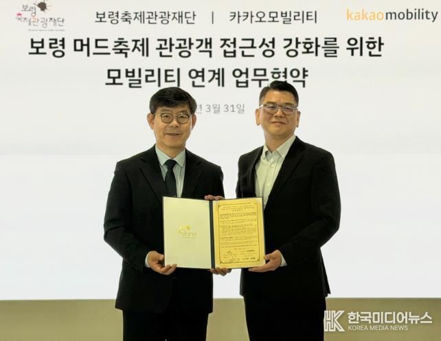 (재)보령축제관광재단은 31일 경기 성남시 판교 카카오모빌리티 본사에서 주식회사 카카오모빌리티와 ‘제29회 보령머드축제 관광 모빌리티 연계 서비스 도입을 위한 업무협약(MOU)’을 체결했다.