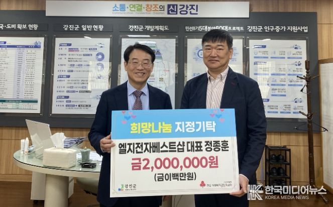 [ 한국미디어뉴스 이종철 기자 ] 정종훈 LG전자 베스트샵 강진점 대표가 지난 2일 지역 어르신들을 위한 이웃돕기 성금 200만 원을 기탁하며 나눔 문화에 앞장서고 있다.