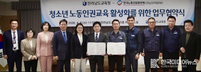 [ 한국미디어뉴스 이종철 기자 ] 전라남도교육청은 4월 8일 청사 5층 비즈니스실에서 한국노동조합총연맹 전남본부와 ‘청소년 노동인권 보호·증진’을 위한 업무협약을 체결했다.