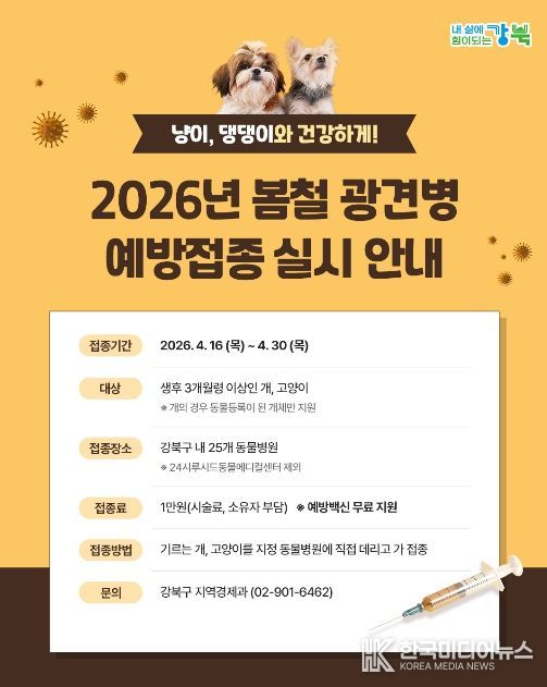 [ 한국미디어뉴스 이원영 기자 ] 서울 강북구는 반려동물과 구민의 건강을 보호하기 위해 4월 16일부터 30일까지 ‘2026년 봄철 광견병 예방접종’을 실시한다고 밝혔다.