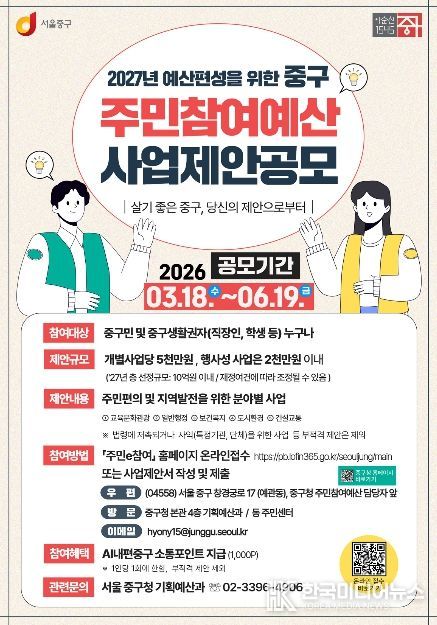 [ 한국미디어뉴스 이보영 기자 ] 서울 중구가 2027년 주민참여예산 사업 제안을 오는 6월 19일까지 접수한다. 주민참여예산에 대한 이해도를 높이기 위한 예산학교는 올해 기초 및 심화 과정으로 확대해 운영한다.