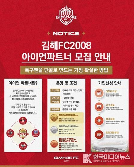 [ 한국미디어뉴스 김홍철 기자 ] 김해FC2008이 지역 상생 및 경제 활성화를 위한 프로젝트의 일환으로 소상공인과 구단이 함께 성장하는 상생 협력 프로그램‘아이언 파트너’를 모집한다고 밝혔다.