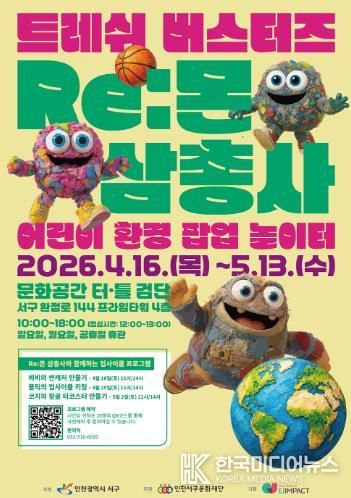 [ 한국미디어뉴스 이기선 기자 ] (재)인천서구문화재단은 오는 4월 16일부터 5월 13일까지 문화공간 터·틀(검단)에서 어린이 환경 체험 전시 ‘트레쉬 버스터즈: Re:몬 삼총사 - 어린이 환경 팝업 놀이터’를 개최한다.