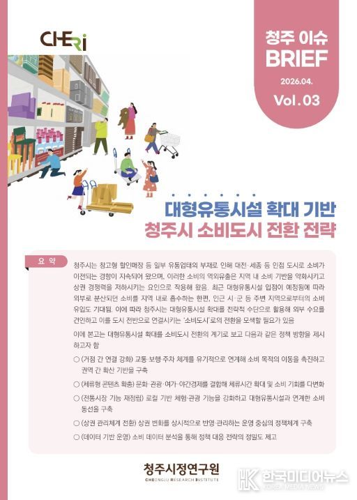 [ 한국미디어뉴스 김풍옥 기자 ] 청주시정연구원은 대형유통시설 확대에 따른 소비구조 변화와 이에 대한 정책 대응 전략을 담은 이슈브리프를 발간했다고 20일 밝혔다.