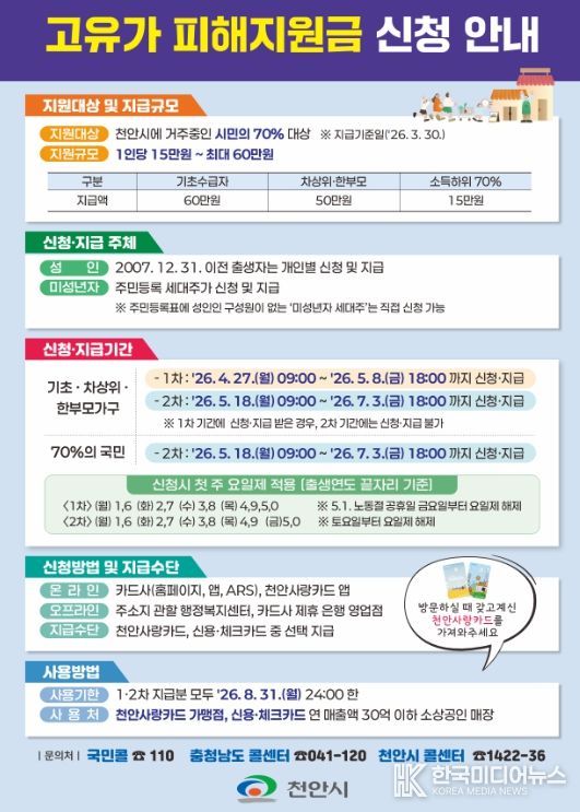 김석필 천안시장 권한대행 부시장은 “고유가로 힘든 시기를 보내는 시민들에게 이번 지원금이 실질적인 버팀목이 되길 바란다”며 “대상별 신청 기간이 다른 만큼 시민들이 혼선을 겪지 않도록 홍보와 행정 지원에 총력을 기울이겠다”고 말했다.