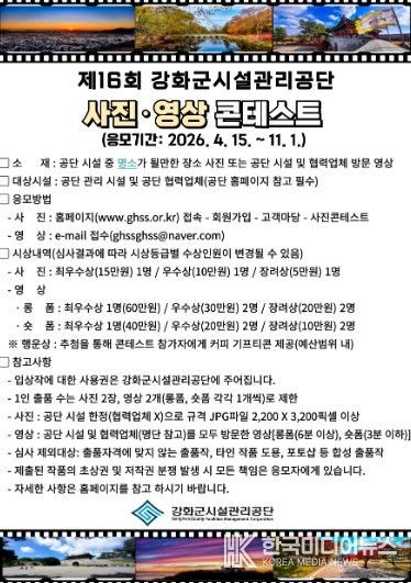 [ 한국미디어뉴스 이기선 기자 ] 강화군시설관리공단이 ‘제16회 강화군시설관리공단 사진·영상 콘테스트’를 개최한다.