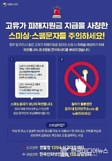 시는 정부와 카드사 등 공식 기관은 지원금 신청과 관련해 어떠한 경우에도 URL이 포함된 문자를 발송하지 않는다고 밝혔다.
