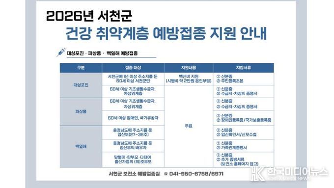 [ 한국미디어뉴스 이원영 기자 ] 서천군은 고령층과 임산부 등 건강 취약계층을 대상으로 대상포진, 백일해, 파상풍 예방접종 지원사업을 추진하는 가운데 올해 백일해와 파상풍 예방접종 지원 대상을 확대한다고 밝혔다.